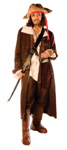 Heavy wool detailed coat, vest with attached shirt, pants, faux leather boot tops, belt, waist sash, sword shoulder belt, faux suede pirate hat. One size fits most adults 42-46.