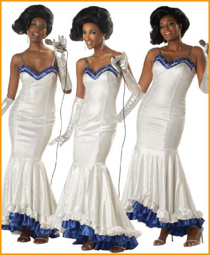 Dreamgirls Movie Halloween Costumes for Women licensed Dreamgirls the motion picture costume for women and teens. each Dreamgirls costume includes: one pair of elbow length silver gloves and one long silver sequin long gown with blue trim. gown features heart shaped bodice and flared/layered/ruffled bottom design. Add the Dreamgirls wig ccc70575 to complete your look. Dreamgirls costumes are sold singly. Price is for one costume, not three.
