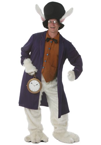 Not only will you look like the White Rabbit - but you will feel like you hopped right off out of the Alice in Wonderland movie in this adult White Rabbit costume! This costume package comes with all the details to set your White Rabbit costume apart from the rest of the Alice in Wonderland group. It includes faux fur pants and a brown ultra-suede vest with blue buttons fits over the top of the pants. The vest is also decorated with a satin black bowtie and two front faux pockets. Adding even more detail and class to this costume, a purple nylon long-sleeve jacket with decorative trim goes over the top of the pants and vest. Your feet and hands will also be covered in the same white fur as the pants with the included fur mitts and oversized shoe covers. The shoe covers have vinyl bottoms and a pair of felt slippers to keep your feet cozy inside the shoe covers are also included. As a finishing touch to this already amazing costume is an included black top hat with attached rabbit ears. The hat is fully lined and secures to your head with an interior elastic strap. Add our round eye glasses and you will be ready for a night of tea parties and grand adventures!