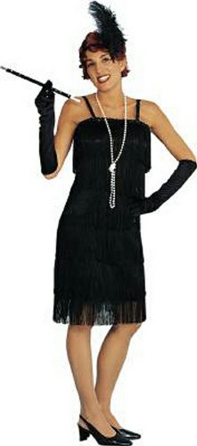 Charleston Costume includes black dress with all over fringe detailing and black sequin headband with feather. Please note shoes, gloves, cigarette holder, and necklace are not included. This flapper costume is Available in Adult Women size Standard one size fits most (fits up to size 12).