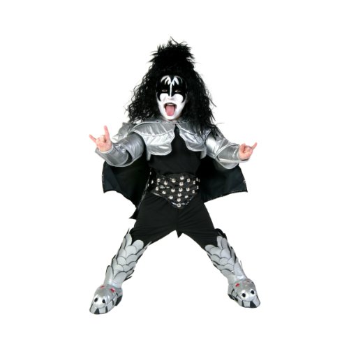 Get this officially licensed KISS costume from their Destroyer tour for your toddler for Halloween! This deluxe Demon Destroyer costume for toddlers includes a long sleeve black shirt and matching black pants made of a polyester and spandex blend. The shirt pulls on over the head for easy wear and the pants have an elastic waist for a great fit. The silver shoulder piece features spikes on the shoulder panels and arm cuffs, along with an attached two piece cape that's designed to look like bat wings. This piece is made of soft poly foam material and has Velcro clasps in the back and on the arm cuffs to secure it. The black belt is covered in metal studs in the front for real rock star attitude and has a Velcro clasp in the back. The silver arm gauntlets are have spikes on the top and are secured with Velcro as well. The authentic Demon boot covers have scales going up the legs, red sparkly demon eyes, two black nostrils and a silver fang design on the toes. Be sure to check out our exclusive child KISS wigs and our makeup kits to complete your little one's rock star makeover!
