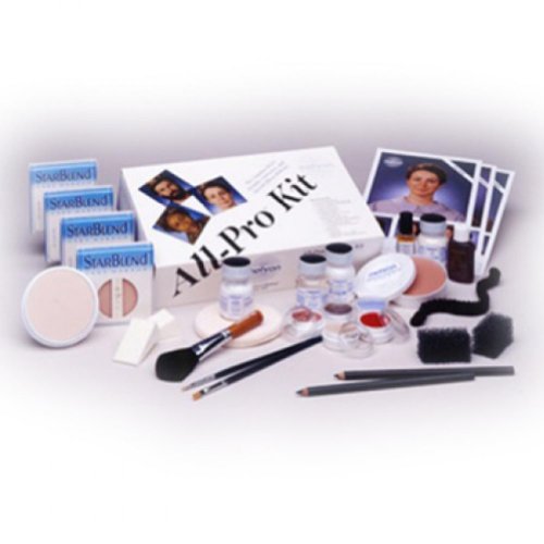 All Pro Theatrical Makeup Kit includes: step-by-step instructions, five full size StarBlend Cake bases (Light Khaki, Rich Topaz, Light Cocoa, Sable, Ebony) (7 gm/color), Black and Brown Pencil Liners, Colorset Powder (0.25 oz), 3 E.Y.E Creams (0.3 oz), L.I.P Cream (0.3 oz), Hair White, Stage Blood (0.5 oz), Modeling Putty/Wax (0.5 oz), Crepe Hair, Spirit Gum (0.25 oz), Liquid Latex (1 oz), 2 Cosmetic Brushes, 2 Foam Sponges, 2 Stipple Sponges, Powder Puff, Powder Brush and Makeup Remover (1 oz).