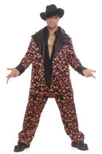 Flame print on black background gives a very unique look indeed. Includes- Black trimmed baggy jacket and matching pants. Jewelry not included. Sizes 46-48. Polyester.