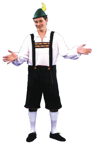 Corduroy knickers and suspenders decorated with red trim, white alpine shirt, and knee socks. Fits most men with chest size 40'' to 42''. Hat not included.