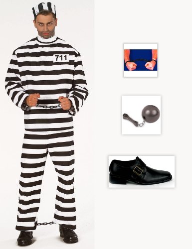 Convict Costume includes: Black & White striped shirt, pants, and matching convict cap. Includes Plastic ball and chain with ankle cuff. Includes Shoes. Includes Flexible plastic shackles with cuffs. One piece mold and very comfortable to wear. One size fits all.